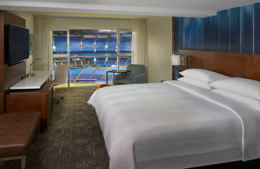 Toronto Marriott City Centre Hotel은 토론토 다운타운의 상징적인 입지를 자랑하는 호텔로, 로저스 센터 내부에 위치한 유일무이한 호텔입니다. 1990년대 처음 개관할 당시부터 ‘야구장 객실을 가진 호텔’이라는 독특한 콘셉트로 세계적인 주목을 받았으며, 현재까지도 스포츠 팬들의 버킷리스트에 오르는 숙소로 자리매김하고 있습니다. 특히 블루제이스 홈경기 시즌에는 경기장을 내려다볼 수 있는 객실이 매진되며, 야구팬이 아니더라도 특별한 도시 경험을 원하는 여행객에게 인기가 많습니다.